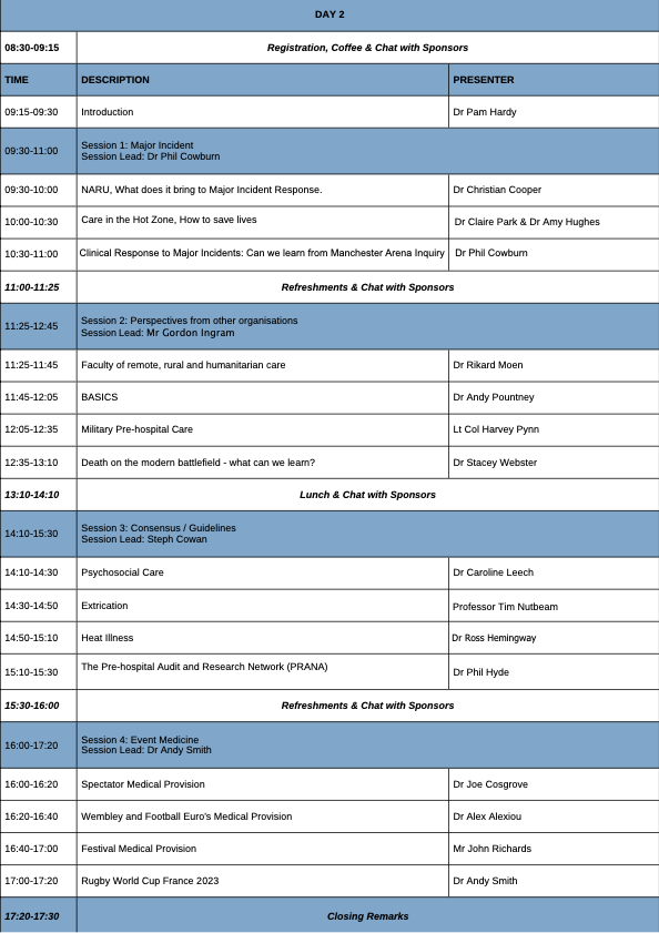 The conference programme is aimed to cater to a broad range of practitioners from first aiders, paramedics, doctors, nurses, students, first responders, voluntary aid workers and remote medics including multi agency teams such as police, fire, and armed forces.